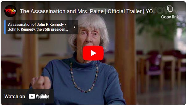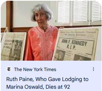 It is sad to see Ruth Paine has died, all be it at 92, as her film closes shown on You Tube. Ruth Paine has her back to the camera; she is heard to say: She hopes that one day history will be correct.